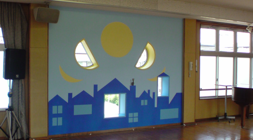 『温度で色が変わるペイント』というカバードインペイントの中でも特殊なミラクルペイントに興味を持っていただき、改修工事に伴って何度か打ち合わせし、遊戯室の一面に窓も含めて変化する壁のご提案。今回は空間にあわせた絵を描きました。