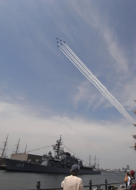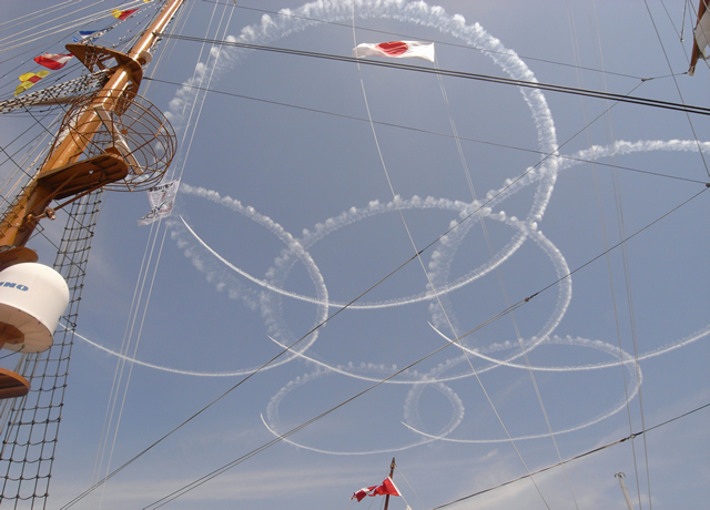 空には航空自衛隊「ブルーインパルス」による航空ショー。
