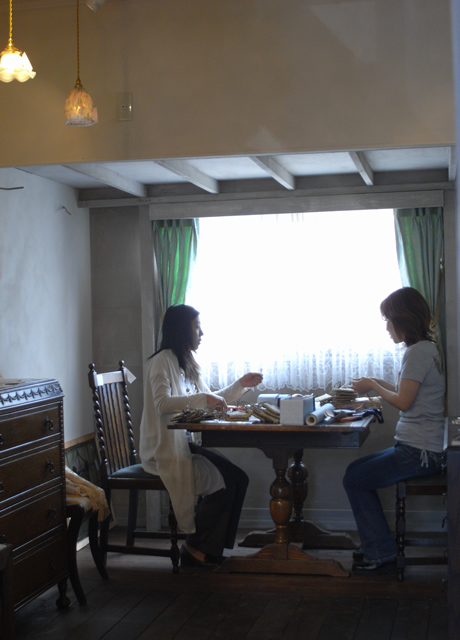 ずっしりとしたイギリスのアンティーク家具を引き立たせる、淡く優しい色の組合せ。