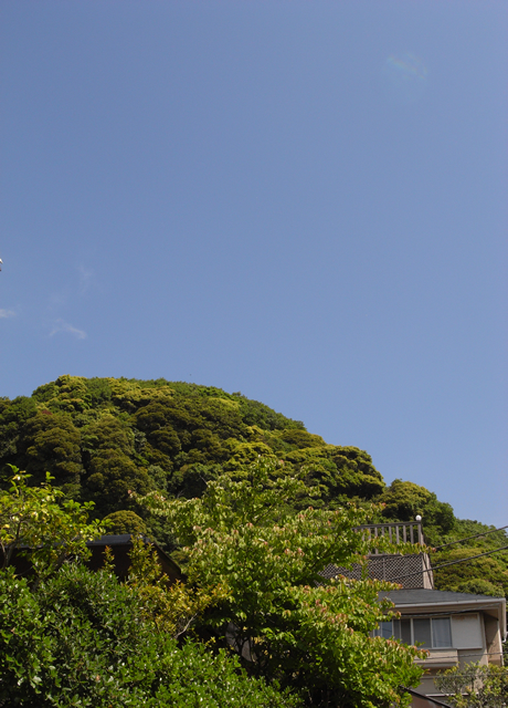すぐ裏山を見上げるときれいに澄み渡る空と、新緑。