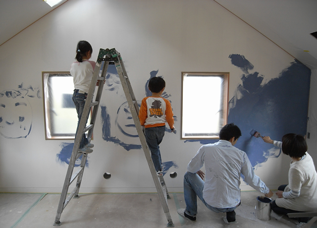 壁が大きなキャンパスになり、刷毛を思いっきり動かして絵を描いたり、