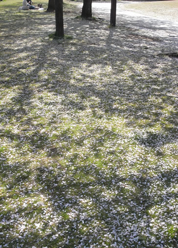 もう桜吹雪で地面が花びらで埋め尽くされ、まるで桜絨毯!