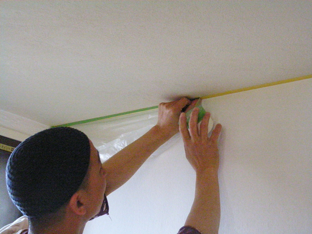 床にポタポタと落ちないように、天井にはみ出さないように…とか塗らない部分を保護する作業。