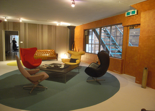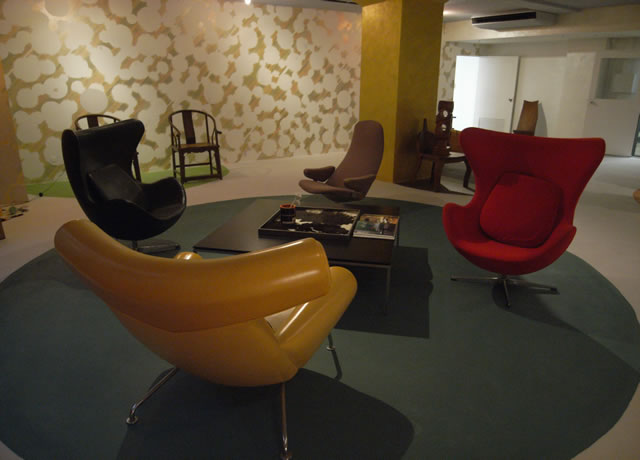 今回、エッグチェアやオックスチェアなど、名だたるデザイナーズ家具やオブジェ・魅力的なワインラックまで一式お借りし、そこにワインボトルを補充するのは日々の日課に。