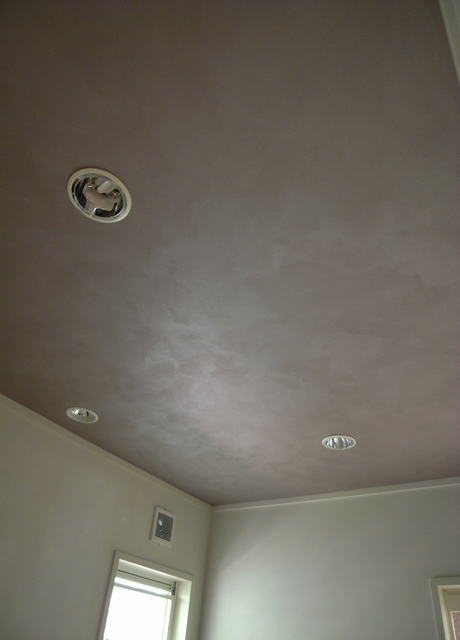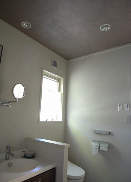 洗面所。天井をメタレッスンで仕上げています。上品な光沢とベリー系の色味が照明にこだわった、ホテルのような空間を引き立てています。