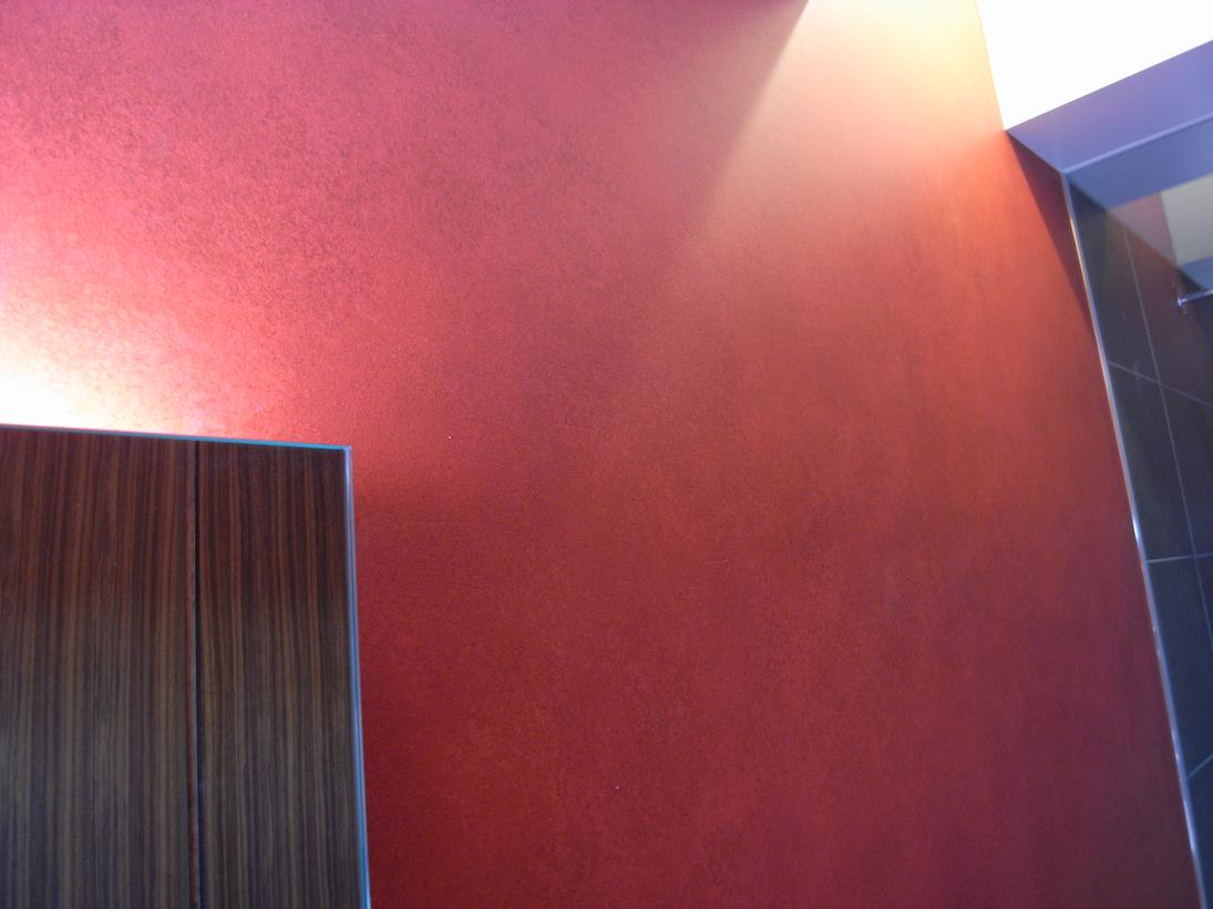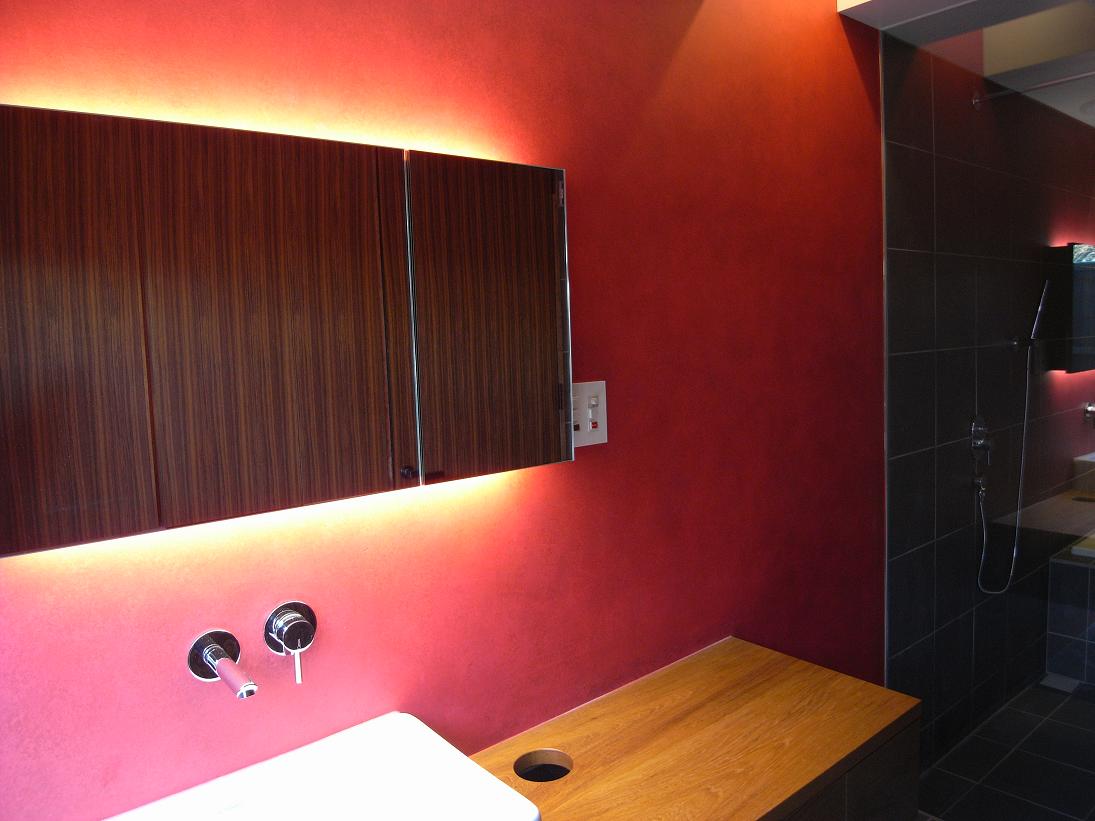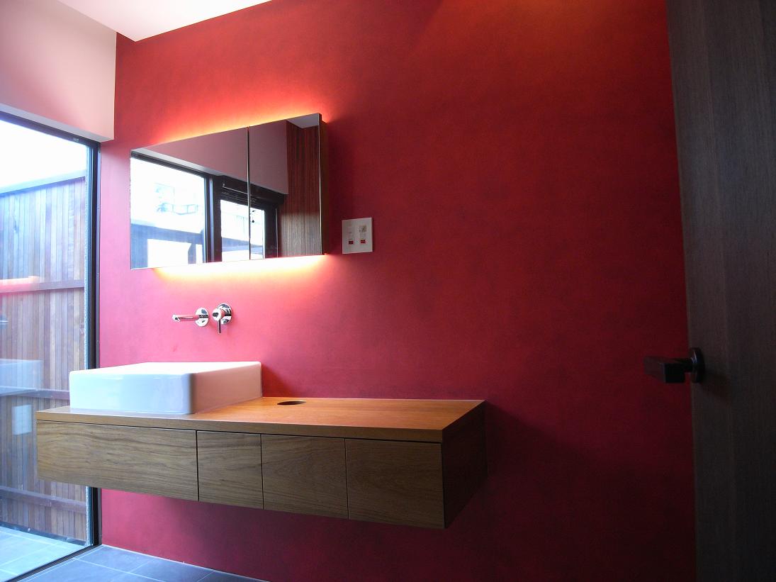 赤に拘った洗面所の一面。