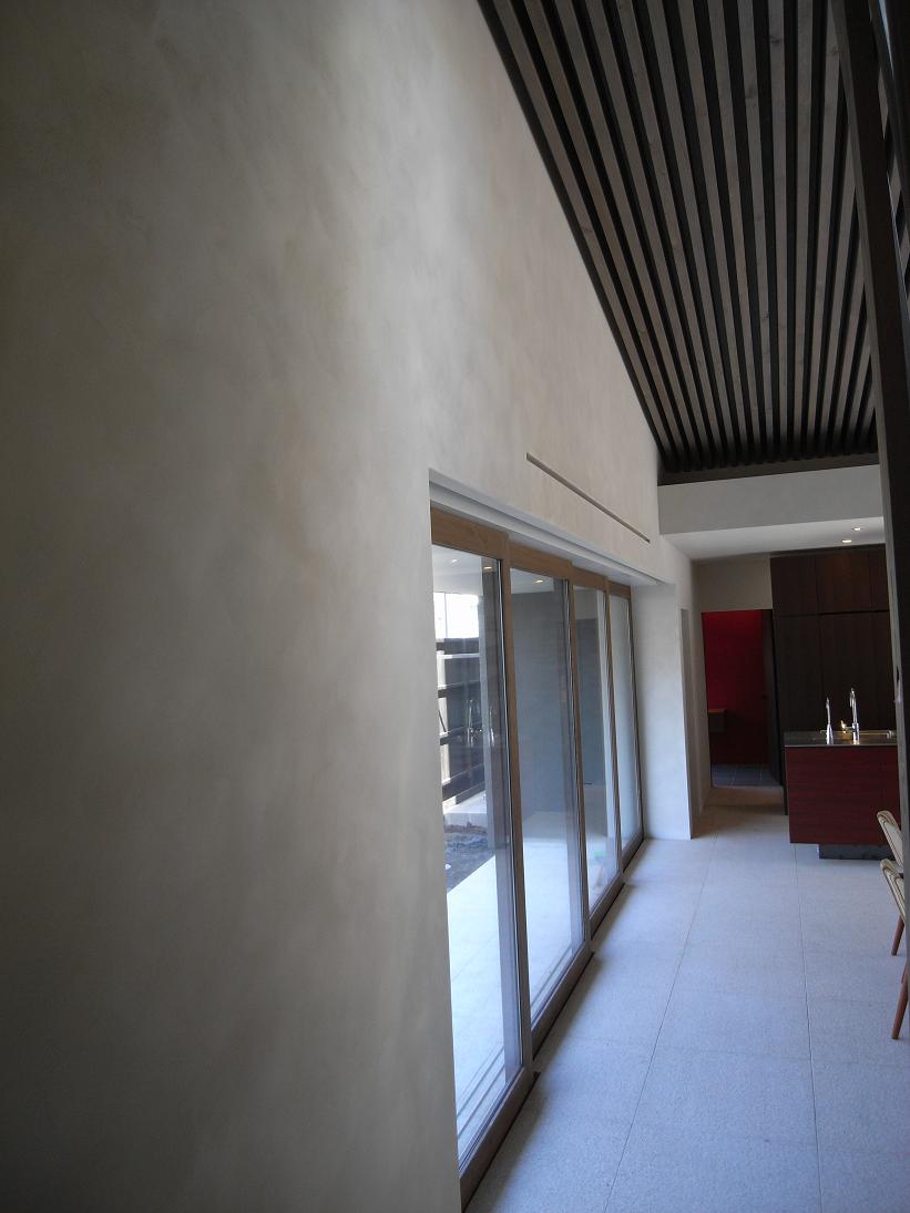 クレイプラスターの施工、実はこの壁材、日本初使用。通常ペインターとしてあらゆる材料を使いこなしているペインターにとっても様子を見ながらの作業。