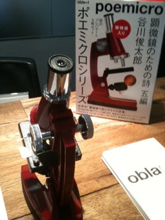 エントランスにて今日から置かれているのが、顕微鏡で読むガラスの詩集という、ポエミクロシリーズ。第一弾が谷川俊太郎の詩集。