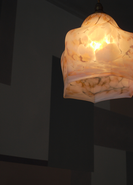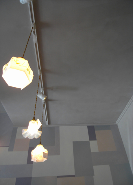 バックの壁は、もともとパイン材を張り合わせたものを、石灰塗料を使って古めかしく。
